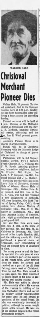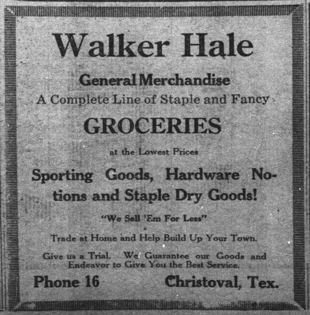 By April 1918, Walker Hale and family had relocated to San Angelo, Texas. The San Angelo Evening Standard reported that Hale purchased the stock of merchandise from Jeff P. Thomason, of Christoval, Texas.[28] The article continues by saying that the Hale family would occupy the “Sheppard cottage” until the “Rogers cottage” adjoining the Christoval store was vacated by Thomason. A later article states that while Hale purchased Thomason’s stock, his business was run out of the town’s old post office building.[29]