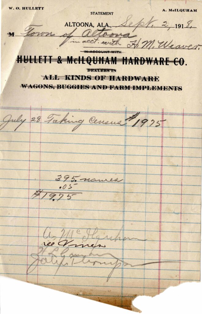 The third partner, and later councilman during Hale’s tenure as mayor is Archabald (Archie) McIlquham. Archie was born April 1869, in Scotland.[20] He arrived in the United States on December 22, 1886, aboard the ship Furnessia. McIlquham married Alice Bailey June 2, 1887, in Laurel County, Kentucky. He came to Altoona about 1910, where he was enumerated on the census as a foreman in the coal mines. By 1912, he owned two houses on the southwest corner of 7th Avenue and Blount Street in Altoona.[21] It appears that McIlquham had no prior experience in business and bought into the store as an alternative to a life in the mining industry.