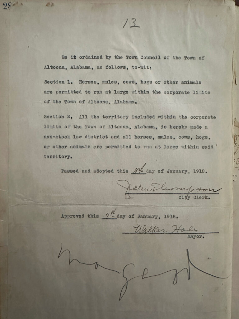 The January 3rd ordinance was very simply and deliberately worded: “All the territory included within the corporate limits of the Town of Altoona, Alabama, is hereby made a non-stock law district and all horses, mules, cows, hogs, or other animals are permitted to run at large within said territory.” There is no background on why this ordinance was drafted and brought before the council. It was not reported in any local paper and in hindsight, it appears to be an interesting stance to take. The stock law debates were well over a decade old at that point, and while there were areas where stock still roamed at large, it was almost unheard of in towns and cities during this time.