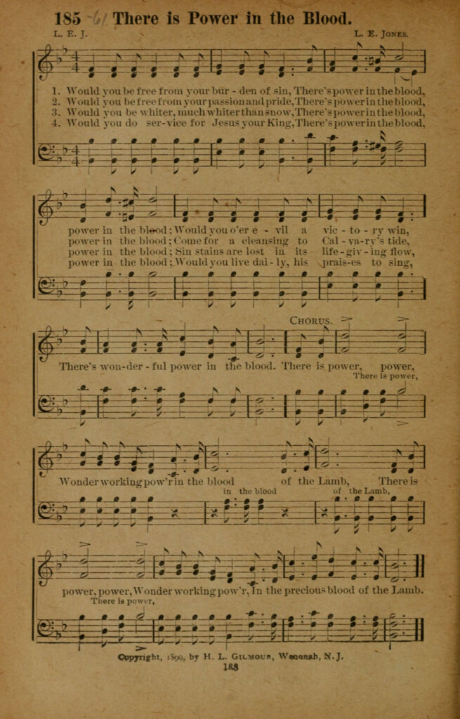 At this point, my thoughts turned to the letter and information Mr. Jones sent me during my research on his grandfather. One sentence stuck out to me, “His wife, Mary would later recite to her grandchildren how Lew asked her to write down the words to, ‘There is Power in the Blood.’ She demurred protesting that she didn’t trust her ability to do so. But she concurred and helped him.” Based on this, the song, “Power in the blood” was composed after their marriage in 1904.[6] I did some searching and found a site, hymnary.org that appears to be the go-to database for hymns, hymn books, composers, etc. I did a search for “Power in the Blood” and was presented with the hymn page showcasing the text, author bio, scripture text and a plethora of other information.[7] At the very bottom of the page is a section called “instances,” which references where the song can be found in various hymn books in the database. Searching through instances revealed something very surprising. “Power in the Blood,” first appeared in the 1899 Songs of Redemption hymn book published by the Christian Witness Company of Boston.[8] It also appeared in other song books in 1900 and 1901.[9] In fact, the site holds records of it being published in various hymn books up 1904, the date that Lewis Ellington Jones married his wife.