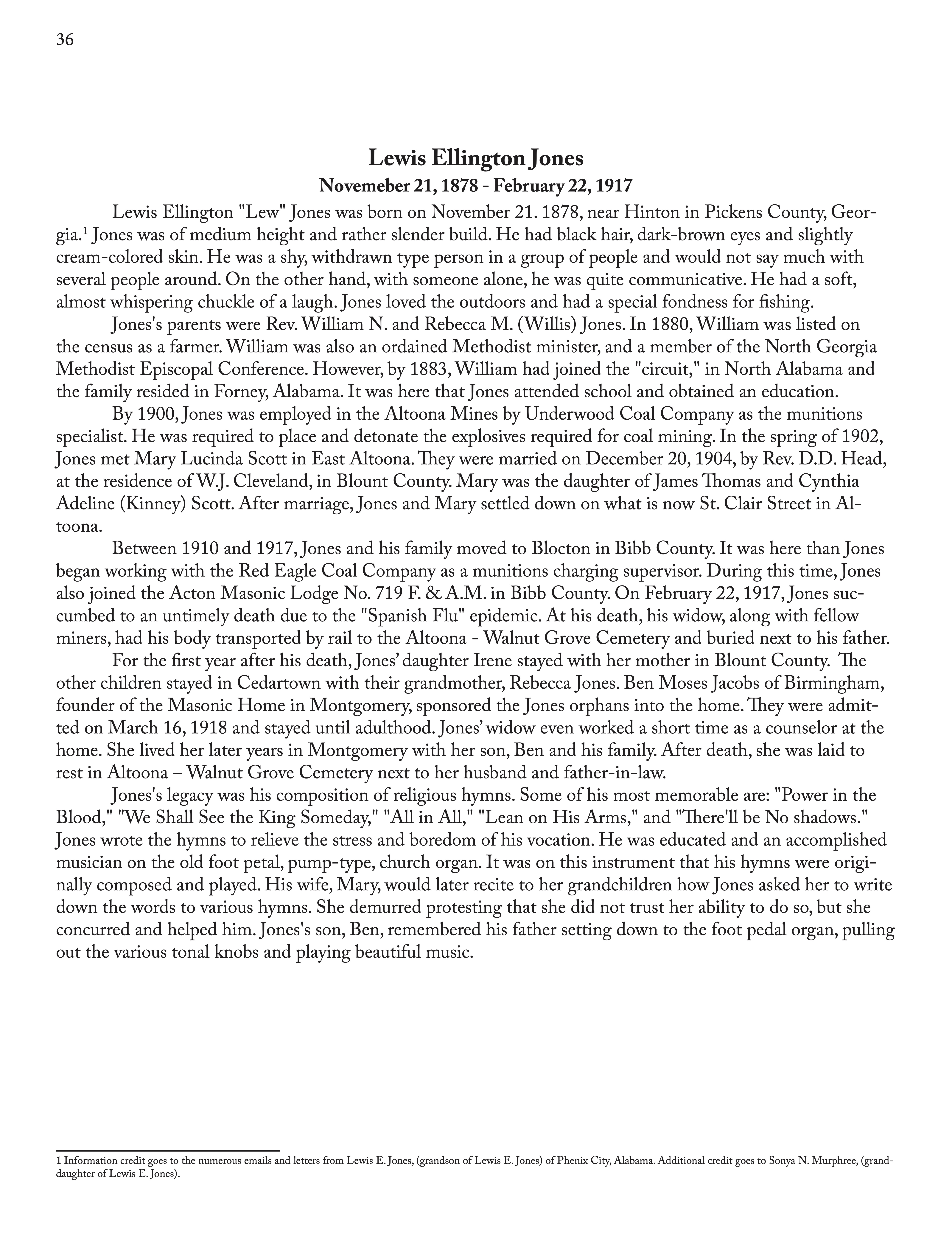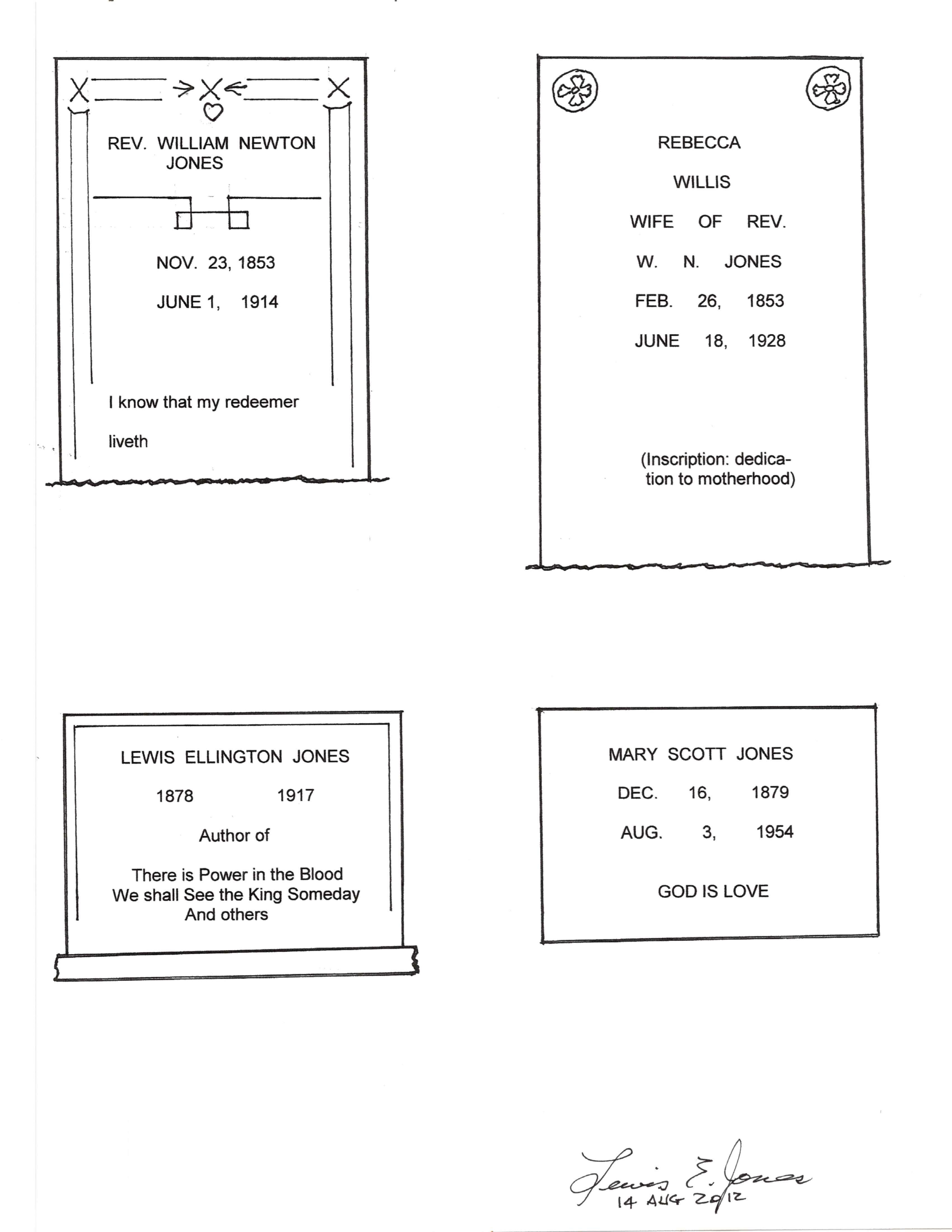 As I did with all the individuals in the book, I began researching on Ancestry, building information, and compiling a family tree. From that point I tracked down the names of children and, in some cases, grandchildren, to begin the process of contacting living descendants for information. In the case of Lewis Ellington Jones, it all began with a simple trip to the cemetery. I found his headstone with the epitaph, “Author of There’s power in the blood, We shall see the king some day, and other songs.” His plot also included a second headstone for his wife, Mary Scott Jones. After conducting further Ancestry research, I was able to track down a several living descendants. One, grandson (and namesake) Lewis Ellington Jones, of Phenix City was especially helpful with providing most of the information on the life of Jones.[1]