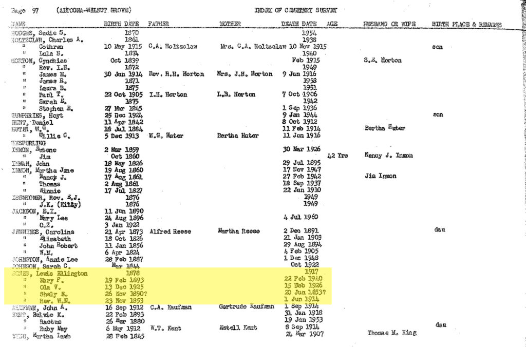 [3] Church of Jesus Christ of Latter-day Saints. 1963. Index of Cemetery Survey Etowah County Alabama, Page 92.
