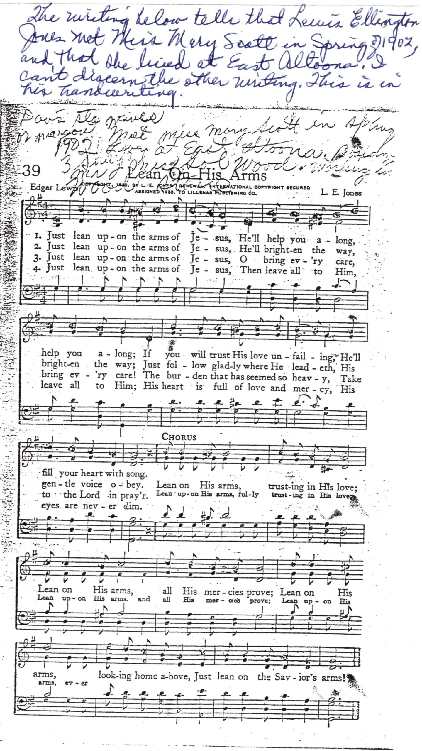 In his notes on his grandfather, Mr. Jones wrote: “Lew was educated and an accomplished musician on the old foot petal pump-type church organ. To relieve the stress and boredom of his vocation, he composed religious hymns. His wife, Mary would later recite to her grandchildren how Lew asked her to write down the words to, ‘There is Power in the Blood.’ She demurred protesting that she didn’t trust her ability to do so. But she concurred and helped him. Lew’s Son, Ben remembered his father sitting down at the organ, pulling out the various tonal knobs and playing beautiful music.” Also included with the letter was a photocopy from a hymn book with sheet music for “Lean on His arms.” There are two sets of handwriting at the top of the page and around the title. The first, closest to the title reads, “Davis…. Met miss Mary Scott in spring 1902, living in East Altoona…” The remaining part is illegible. Directly above this is a second note in blue ink which states, “The writing below tells that Lewis Jones met Miss Mary Scott in spring 1902, and that she lived at East Altoona. I can’t discern the other writing. This is in his handwriting.”[2]