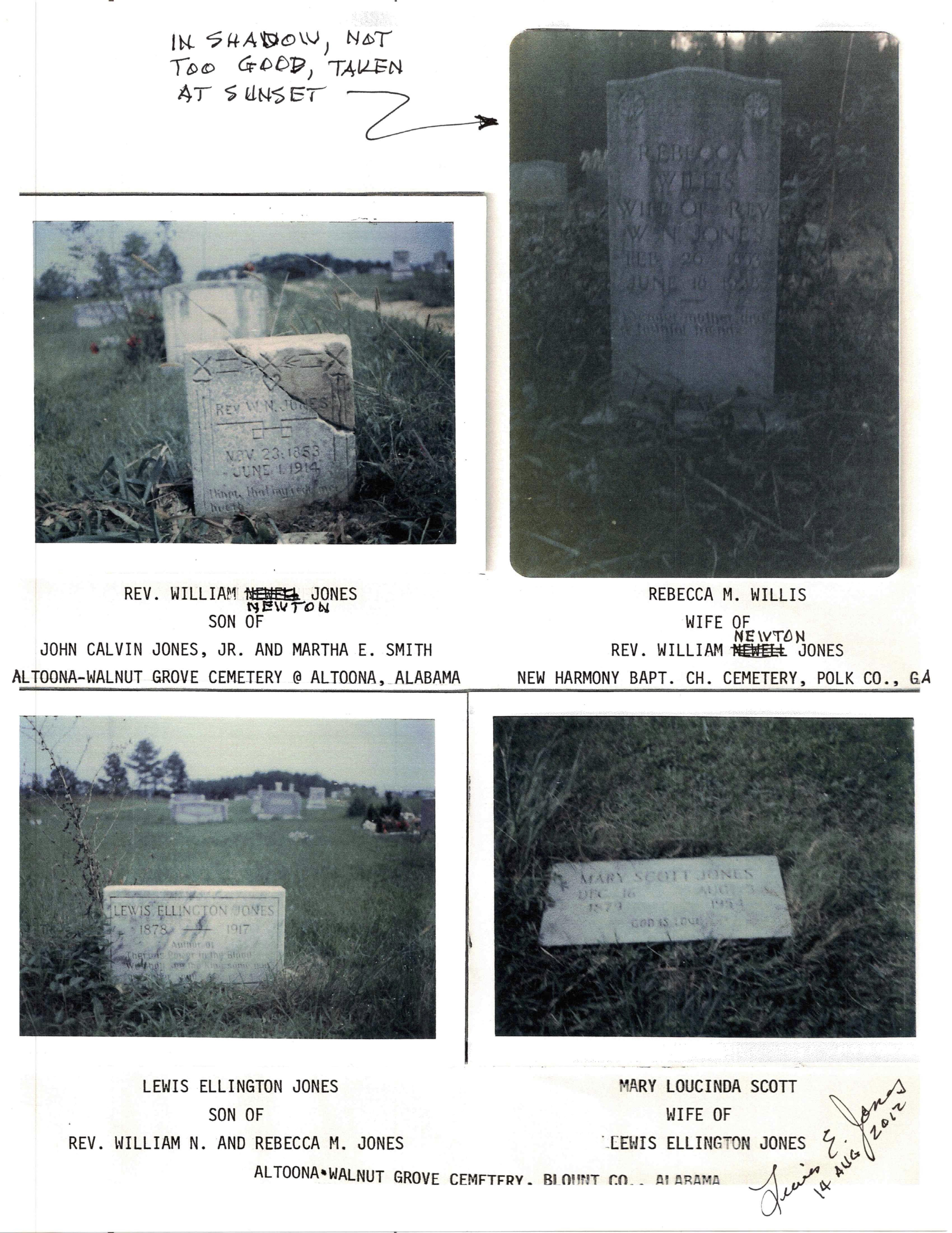 He provided me with several photographs of the headstones of Lewis Ellington Jones and his wife from the 1970s, as well as a photo of a third headstone, that of Rev. William Newton Jones, the father of Lewis Ellington Jones who was also buried in Altoona-Walnut Grove Cemetery. Mr. Jones later explained that Rev. Newton Jones headstone was later destroyed by inmates who were assigned to clean the cemetery. Mr. Jones attempted to repair the headstone, but his efforts were unsuccessful, and the headstone was later lost.