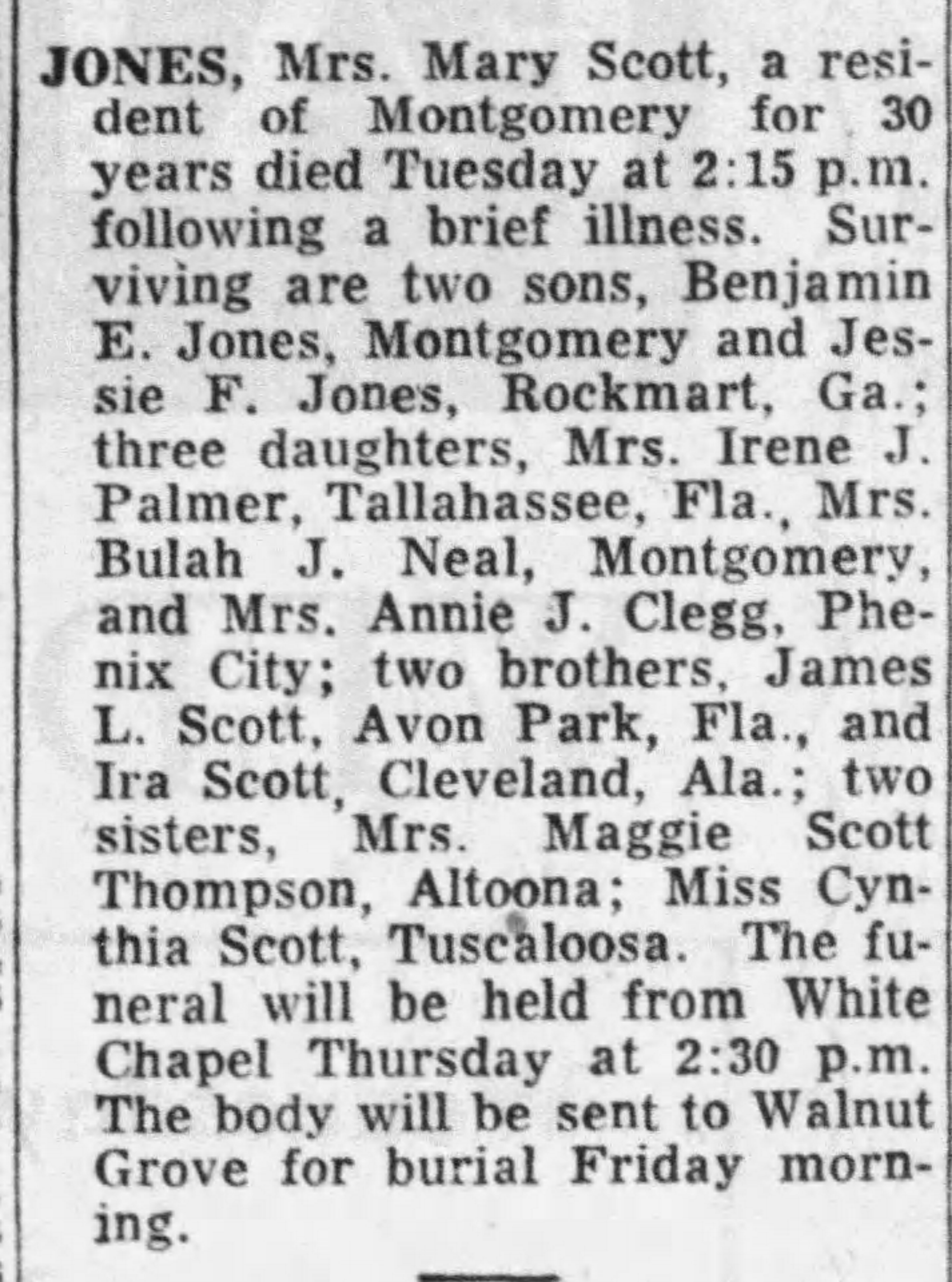 [2] “Jones, Mrs. Mary Scott,” 4 August 1954, The Montgomery Advertiser, Page 6.