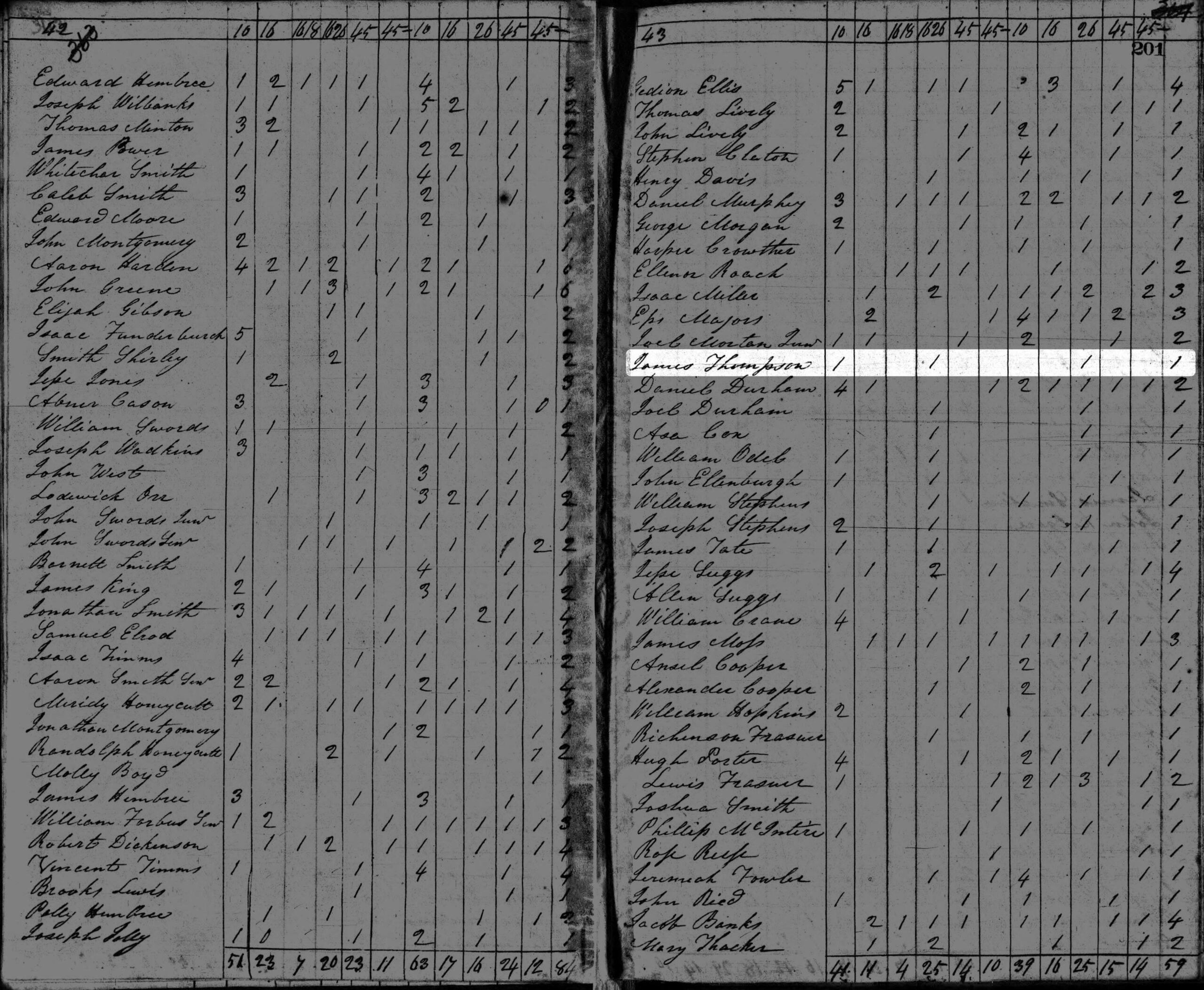 In 1820, the young couple appears in the 1820 census in a household that included their oldest child, Jackson Thompson.[28] A review of the original record reveals an additional “1” in the far-right column of the page; however, the column heading is blank. This mark could indicate that Thompson owned a single enslaved person, though it would be the only record in which he appears as a slaveholder. Moreover, every other household listed on the same page contains between one and four marks in that column, despite the absence of a heading. The purpose of the column therefore remains unclear. No land records have been identified for Thompson during this period, a question that may be connected to this census entry. His next-door neighbor was his father-in-law, Daniel Durham, suggesting that Thompson resided on Durham’s property following his marriage to Sarah.