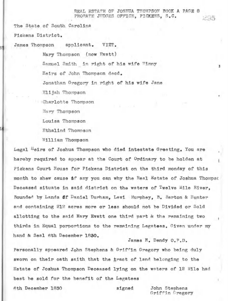 - Pickens County, South Carolina estate file for Joshua Thompson, Box 1, No. 1, 1829. ↑