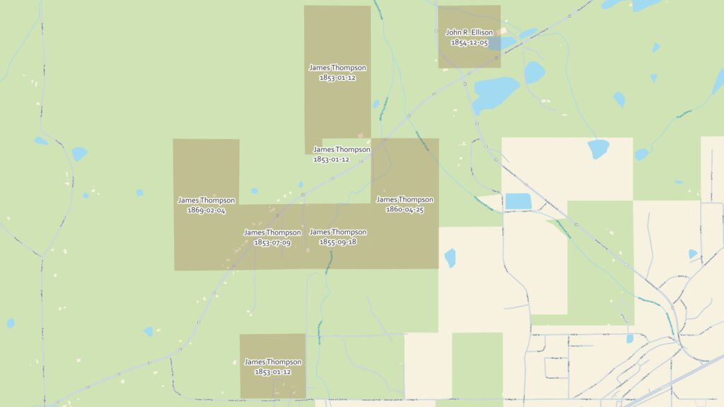 Throughout the following decade, Thompson continued expanding his landholdings. He acquired 40 acres from John R. Ellison in 1854; 40 acres from Andrew and Mary Hale in 1855; 40 acres from William Byrd in 1858; 80 acres from the Commissioners Court of Blount County in 1860; and 80 acres from Edmond Youngblood later that same year.[39] Not all of these parcels were contiguous. A 40-acre portion of the 1853 Waid purchase lay southwest of his principal holdings; the Ellison tract was located at Ellison Crossroads; and the Byrd parcel was situated along present-day Highway 278 near the Blount–Etowah County line.