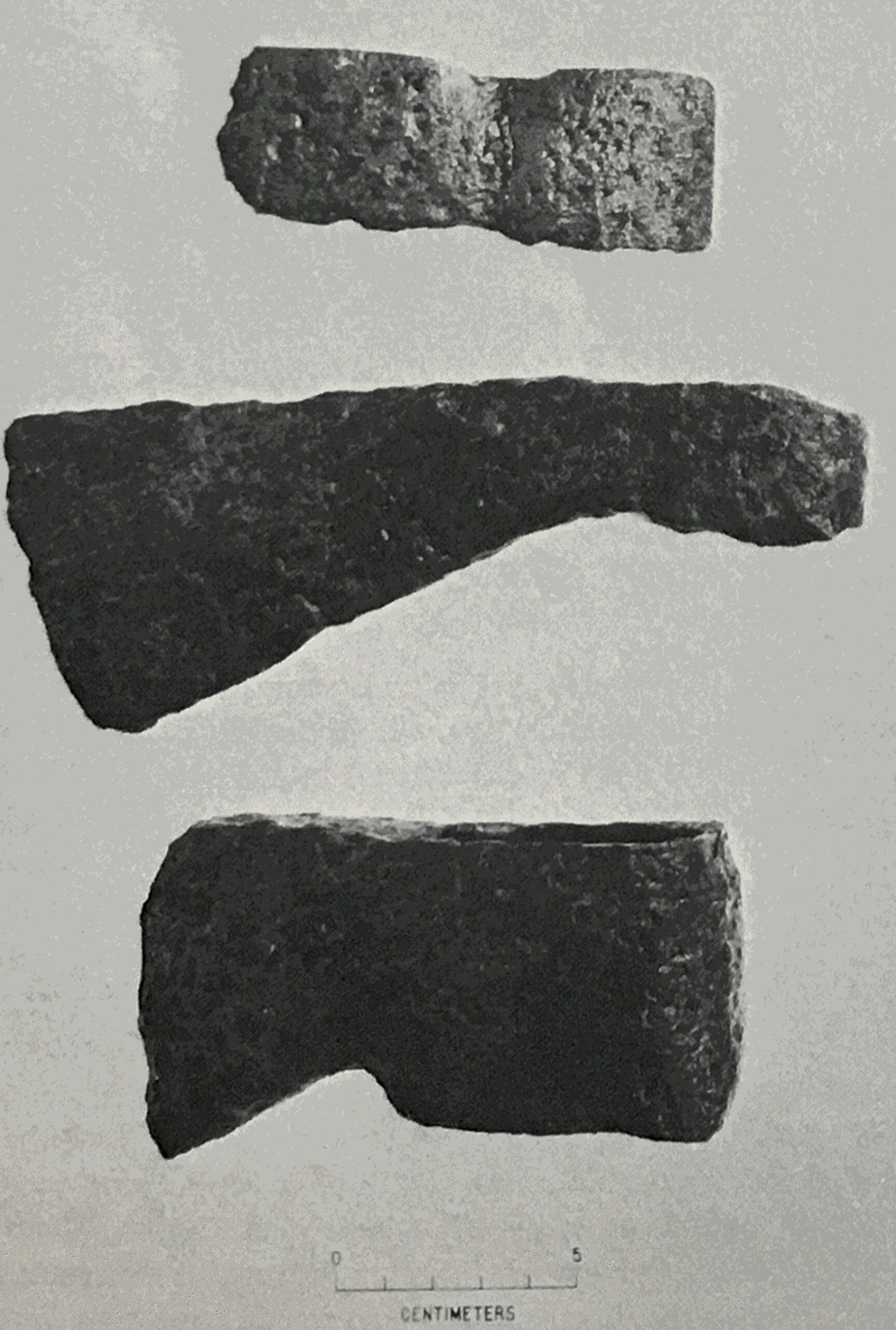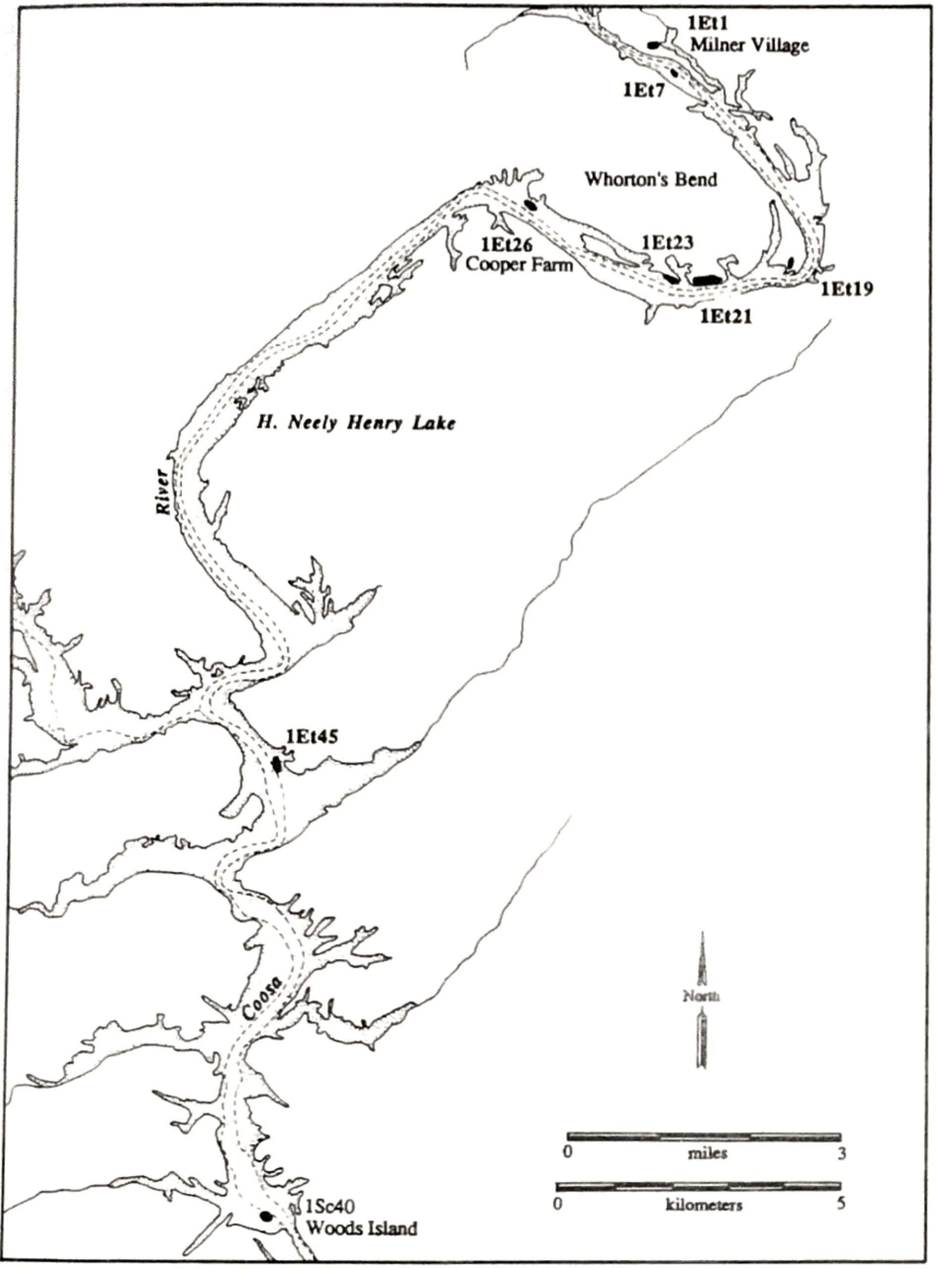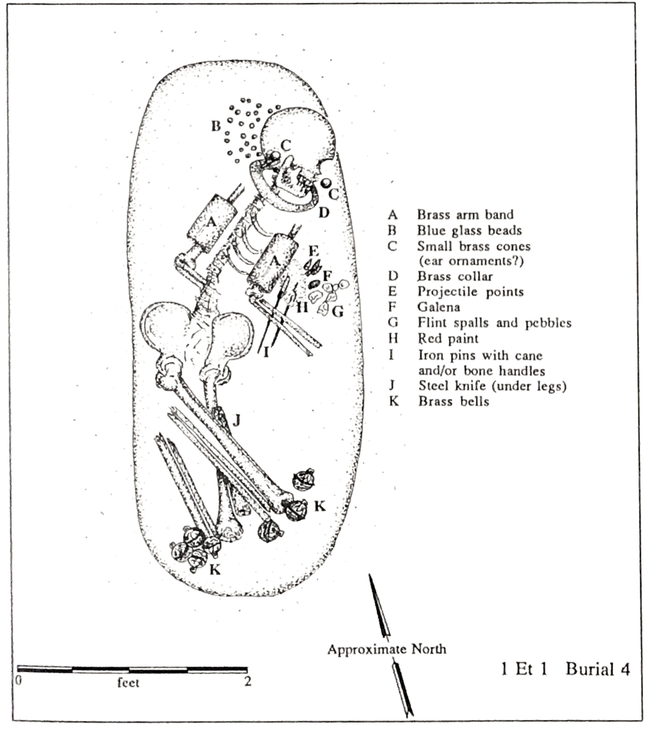 The artifacts and burials themselves are not unusual in any way. Roughly three miles north of Henry’s Land. is another well documented site known as Milner’s Village (1Et1). The Milner Site was first excavated by David DeJarnette and Steve Wimberly in 1948. The site, measuring 6.8 acres, was dated from 1630-1670, and contained a total of eight burials. These burials were accompanied with projectile points, pots, pipes, glass beads, collars, arm bands, bells, other brass objects, axes, awls, and an iron knife. When comparing the burials and accompaniments of the Milner Site with that of the Whorton Bend description, the two match almost perfectly. The Whorton Bend description of ornaments and weapons of war, including tomahawks and knives can be visualized in the objects from the Milner Site.