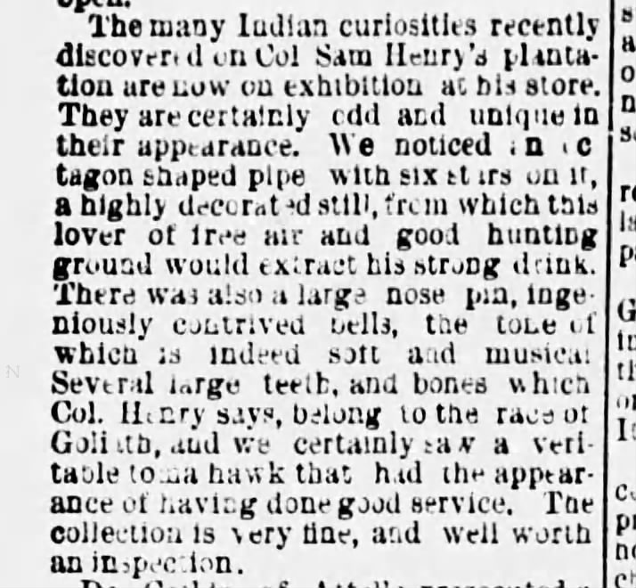 The final version of the story is found in the Montgomery Advertiser:[11] “The many Indian curiosities recently discovered on Col. Sam Henrys plantation are now on exhibition at his store. They are certainly odd and unique in their appearance. We noticed an octogen shaped pipe with six stars on it, a highly decorated still, from which this lover of free air and good hunting ground would extract his strong drink. There was also a large nose pin, ingeniously contrived bells, the tone of which is indeed soft and musical. Several large teeth, and boned which Col. Henry says, belong to the race of Goliath, and we certainly saw a venerable tomahawk that had the appearance of having done good service. The collection is very fine, and well worth an inspection.”