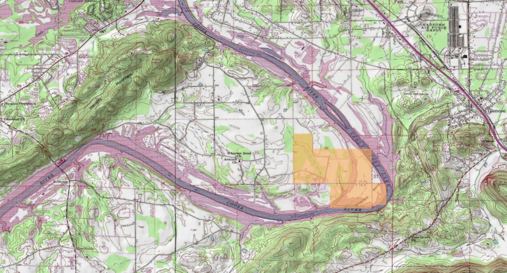 A story that has been visited several times over the years is that of the ancient graveyard that was unearthed during the flood of 1886. The main crux of the tale is that of a 12-foot giant discovered among the remains. This story appeared during Will I. Martin’s articles in the Gadsden Times and was retold more recently in the writings of Mike Goodson and Danny Crownover, within Gadsden Times and Messenger[1] The story of the Whorton Bend Giant has also found a larger audience both within book form and the internet.[2] While this piece will include a retelling of the story, it also serves a purpose to dig deeper, and explain exactly what was found in 1886.