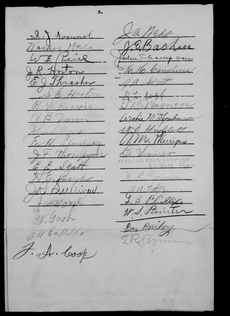 | J.F. Thompson | R.V. Huff (President, Altoona Coal Company) | E.E. Scott |