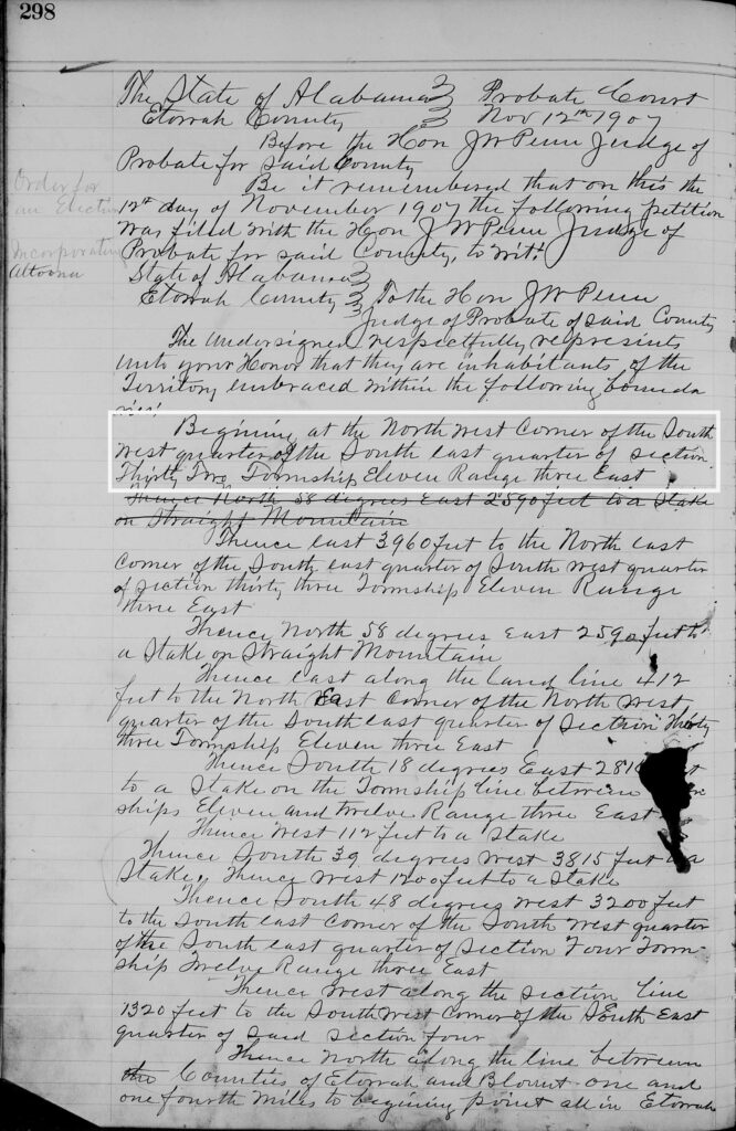 When Altoona was chartered, the corporate limits which were to define the town were to be surveyed, platted, and physically described. This survey, plat, and description were completed on October 31, 1907, and added to the incorporation petition that was later adopted when Altoona was officially incorporated in 1908.[3] For almost 10 years Altoona operated under this charter without any issues. However, at some point, it was discovered that the original survey description was incorrect. The original description states that the survey began in the Northwest (NW¼) corner of the Southwest (SW¼) corner, of Township 11, Range 3 East, Section 32. This was supposed to signify a starting point on the Blount/Etowah County line, as Altoona was to only be incorporated in Etowah County. However, the (NW¼) corner of the Southwest (SW¼) corner, of Township 11, Range 3 East, Section 32 is one mile west of the county line, well into Blount County. This error made the survey illegal, which invalidated the original town charter, and made Altoona nothing more than a name.