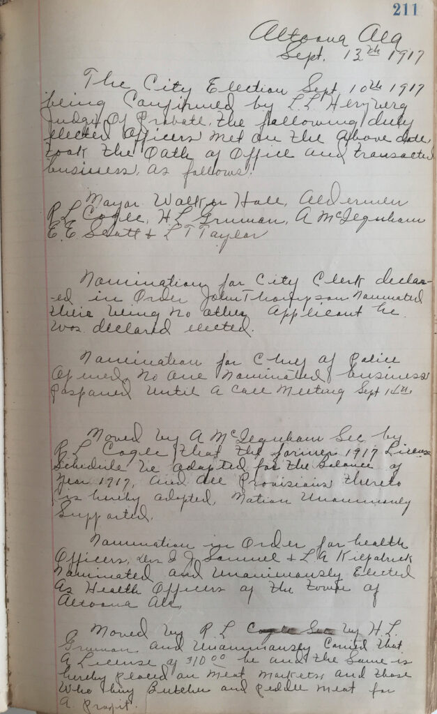 The following day, on the 13th, Probate Judge Herzberg presided over the first council of the reincorporated town. The minutes of this meeting appear on the opposite page of the June 21 meeting, the last meeting held before Altoona lost its charter.[16] Mayor Hale and the Councilmen were sworn in, and the meeting continued in much of the same way it did during their initial inauguration the previous October. John Thompson was reappointed as clerk, while I.J. Samuel and L.A. Kilpatrick were once again sworn in as health officers.[17] Appointment of a police chief was postponed until the following night, on September 14. The remaining minutes of the meeting record the order of drafting Ordinance #1, which was setting a business license schedule. Ordinance #2 was ordered, setting the Ad Valorem tax rate. Attention then turned to the topic of meat markets and butchers with a $10 license fee being levied on both. Ordinance #3 was drafted which placed a prohibition on the sale of meat without inspection by a licensed physician.