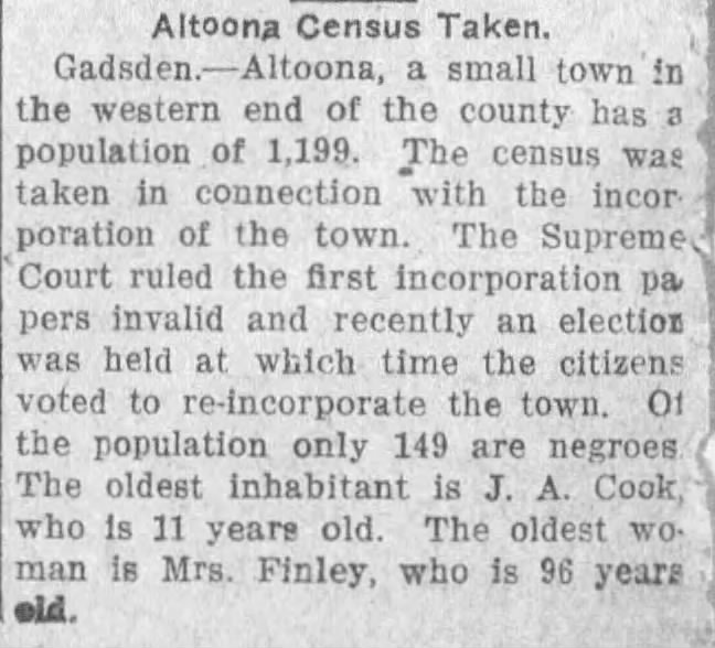 [13] “Altoona Census Taken,” 16 August 1917, The Gadsden Times, P.2.