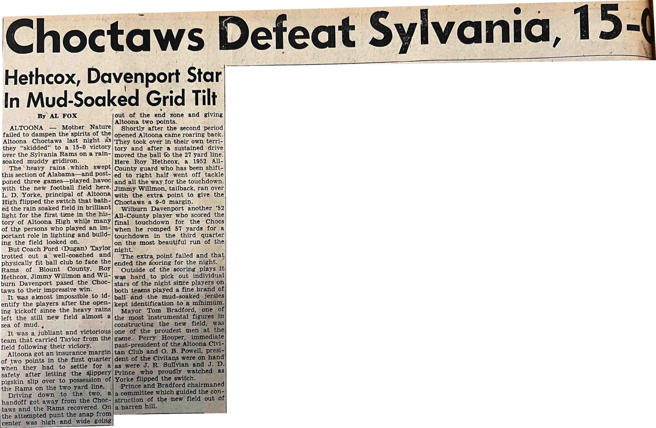 The first game was played on the new field on Friday, September 4, 1953, in which the Choctaws beat Sylvania 15-0.[6] In fact, the Choctaws were undefeated at home the entire year. While there was no discussion regarding field lights, the 1954 Pow-Wow annual shows the football team on the field with lighting in the background.[7] While the field was utilized, there was still no space for the players and coached to shower and congregate before, during, and after the game.