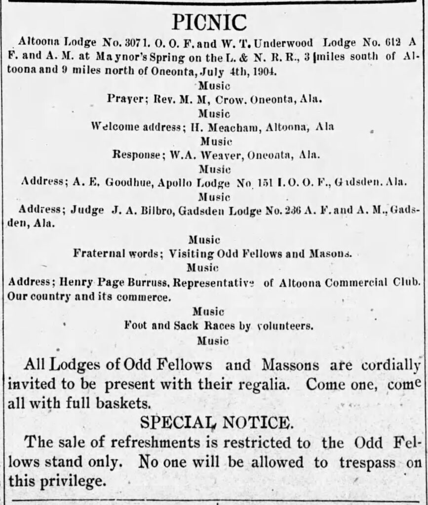 There is evidence that the cleared area was used for company picnics, field days, baseball, and public events. Senator William Bankhead utilized the area on a political visit to the town during this time. The area that compromised the parking lot across from the softball field was used as an area to park coal trucks. The spot where the rec building is situated was crisscrossed with trails and paths, apparently owing to the miners who walked to and from work each day. These paths and the shape of a baseball infield is clearly visible on the 1942 aerial photo of Altoona.